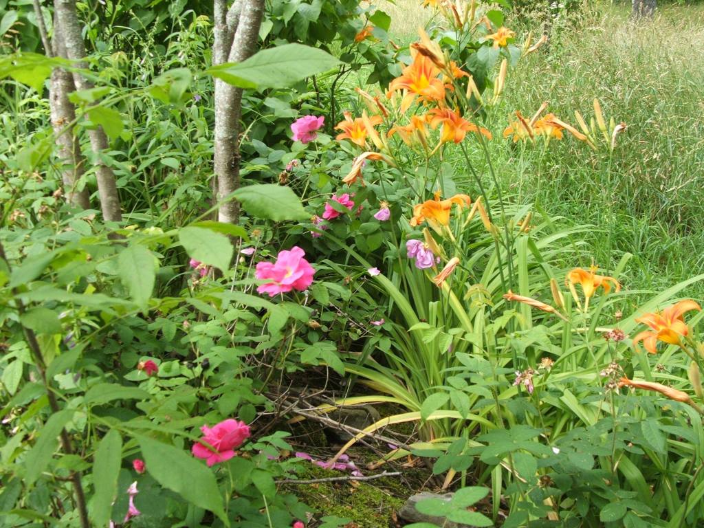 It was here among these roses, and day lilies I feel in love with books spending as long as I could reading. I would take a small pillow, and lay on the large, flat granite rock, it was very hard, but I did not mind. In this photo where I laid is covered with moss.