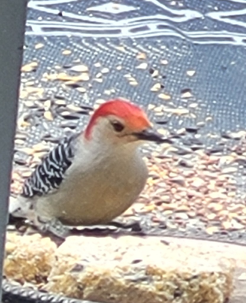 Today the Cowbirds are out there with their blip, blip, chitter sounds. Some are similar to plimp,plimp. The hang out in a group of 7. The males doing a courting dance, by chattering. Holding wings out with tails up. The girls seem to coyly ignore them. My red bellied woodpecker does a cha, cha, cha noise. He has become quite verbal, he acts delighted at finding the food.