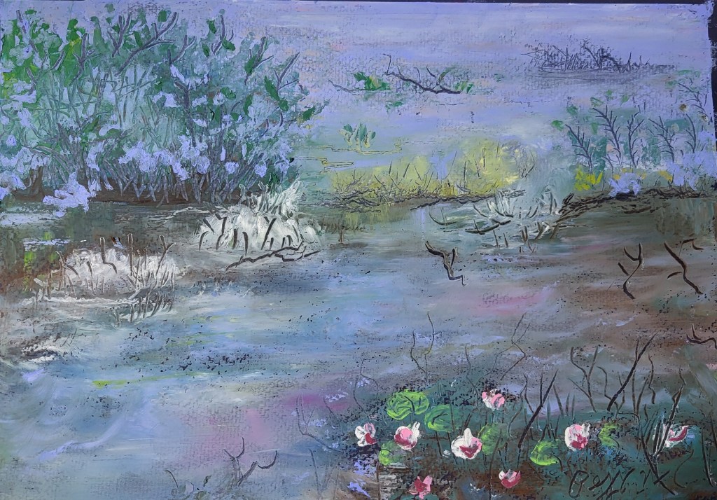 A simple little oil pastel painting. There needs to be a couple small tweaks, I think. Highlights. It has been over 20 years since I painted in oil pastels. How they work apposed apposed to soft chalk pastels the question. What is important is the composition. I have been focusing in on composition by reading about it, sketching, and relearning mediums I have not used in a while. Charcoal for one, with lots of newsprint! LOL. There is a love, hate reality of charcoal. Love it’s richness. Forgive it messiness. It will loosen you up, especially in gestural drawings.