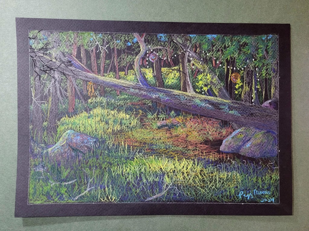 It’s been since 1994 that I have had fun with the pastels. I began Shibui 2011. A lot happened after that. I have my new home in my cottage studio and just now feel I am underway! A new easel awaits me! Varooooom! Or perhaps its “Let’s move it! Move it! Move it! More like that! I love claiming my Boho cottage studio!