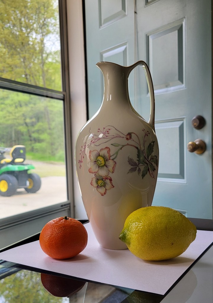 Yesterday’s pastel painting using pastel pencils. I have not completed a full pastel painting with them before. I kept with it. Layering and recording what was there in the still life. The neck of the vase is shortened to fit the paper. The paper is a stiff, smooth paper. I will use a neo color white on the left side, there are the two reflections at the bottom of the vase I am pleased with. They are from the fruit, pale color on the vase.