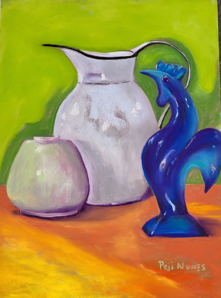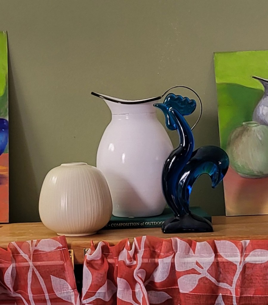 To paint every day is enlightening. Drawing what you see is key. Composing a still life is mote than putting objects down. In this case my mind found this story in the painting. To me the rooster appears to be puffing out his belly to be like the jug and vase. He is a rich color which stands out. “Notice me!” He seems to say.