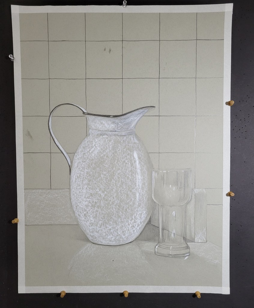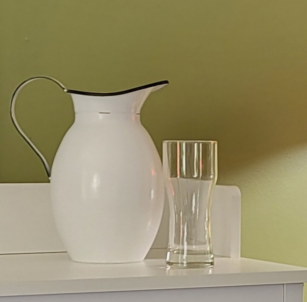 I kept thinking tiles. Tiles like there was in a kitchen when I was a toddler in Appleton, Maine. We lived on a farm there. There was a small house below the farm. Cows, the barn, patures with apple trees. A large green two story chicken house. A beautiful farmhouse with black shudders. A road that lead you b ear a pond. A walk with my mother, her younger sister and me in a stroller. Them telling me to lay down, they hid on me, and I stood up to find them. Didn’t see them. Got mad at them, was climbing out to go home on my own when they showed up. Children are not stupid. I a k ways wondered why they did that. Memories lead us places and come with questions that are not always answerable. Old metal pitchers and shaped glasses from the past. Art that facilitates.
