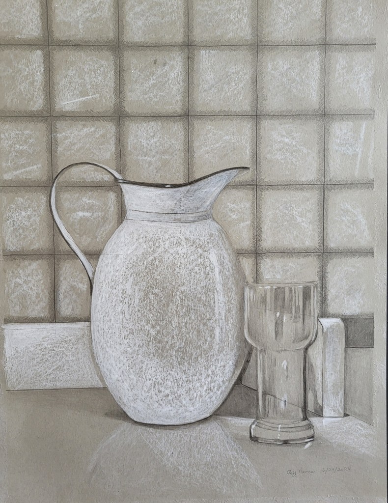 I was told by a fellow artist, Alice that it was much easier to draw on larger paper. 18 x 24. I agree. When I drew prior images I did stuggle with getting things in a better perspective. Now to prepare paper for a next image and to compose that new still life.
