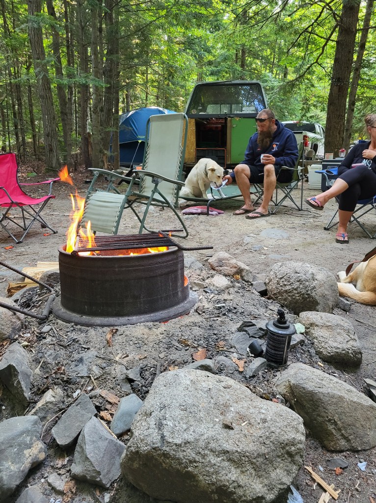 Love a fire when camping! Especially at night. Your see my son-in-law Mike here and daughter Jacobie, and Mikes dog. We went up to Millinocket Maine. Mike and Clair have camping finessed they have a trailer and it’s all in there! Generator and a whole kitchen! I had not camped for years! They are planning to go again. I am invited but undecided.